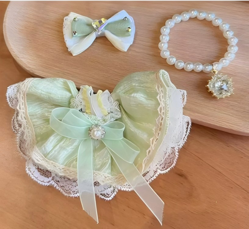 Fresh Green Lace Dress Set (Bow + Dress + Necklace)
